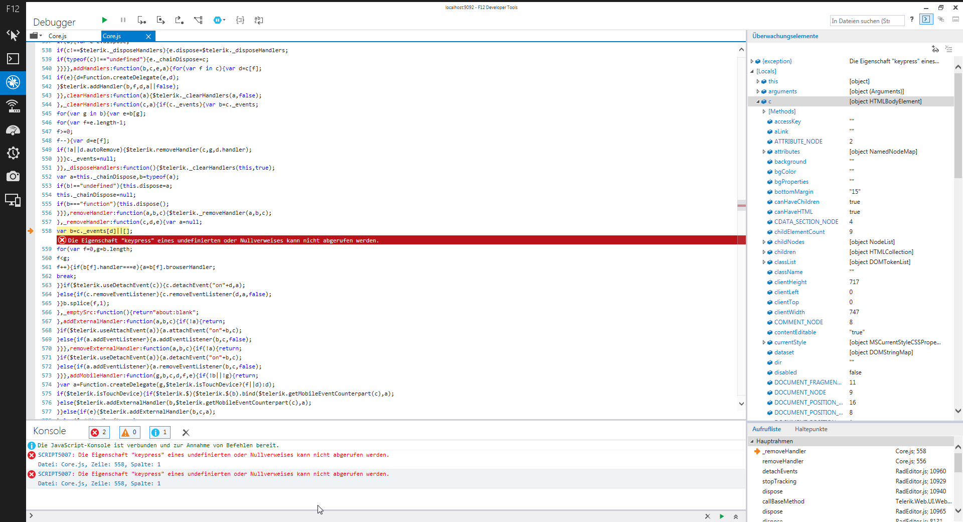 "Unhandled exception at line 558, column 1 in http://aspnet-scripts.telerikstatic.com/ajaxz/2013.3.1114/Common/Core.js