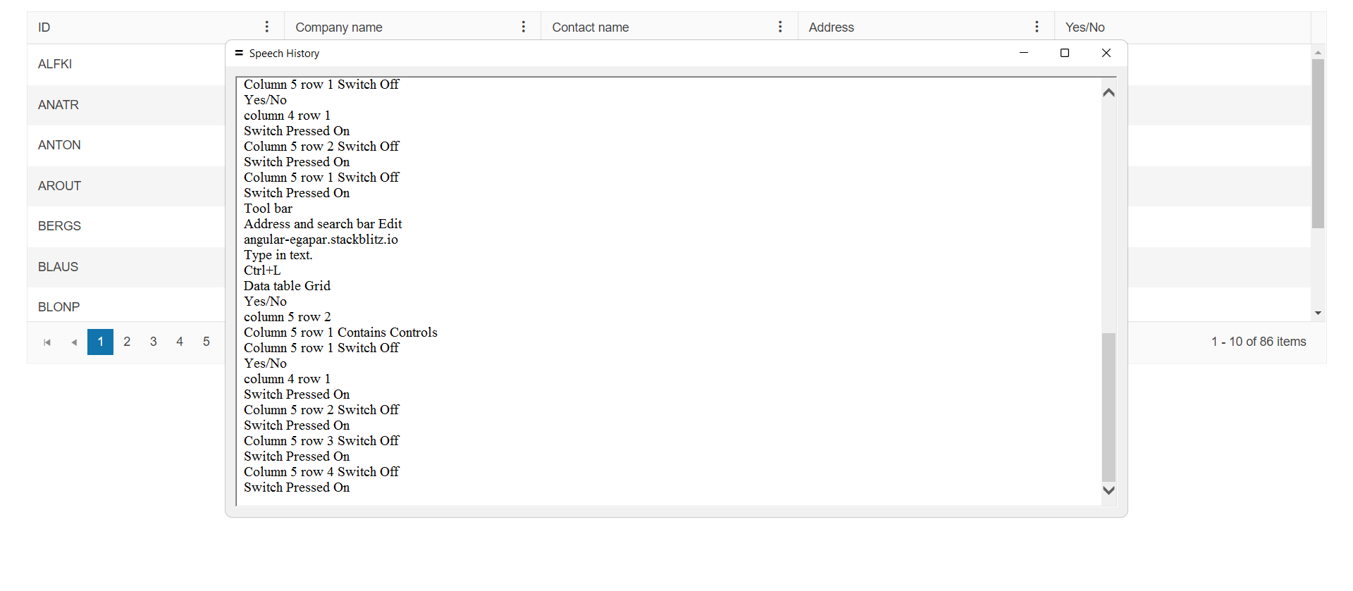 I have a requirement to set ARIA LABEL value dynamically so that the user will know which column and row he is in. While fixing that, I found the JAWS screen reader reading additional comments(colored yellow) other than the content from ARIA LABEL. I am unable to find where it is coming from. This happens only for the first row. Also, the screen reader reads the column header for the second time. Please find the JAWS Speech history below. Attached is the screenshot of the same.