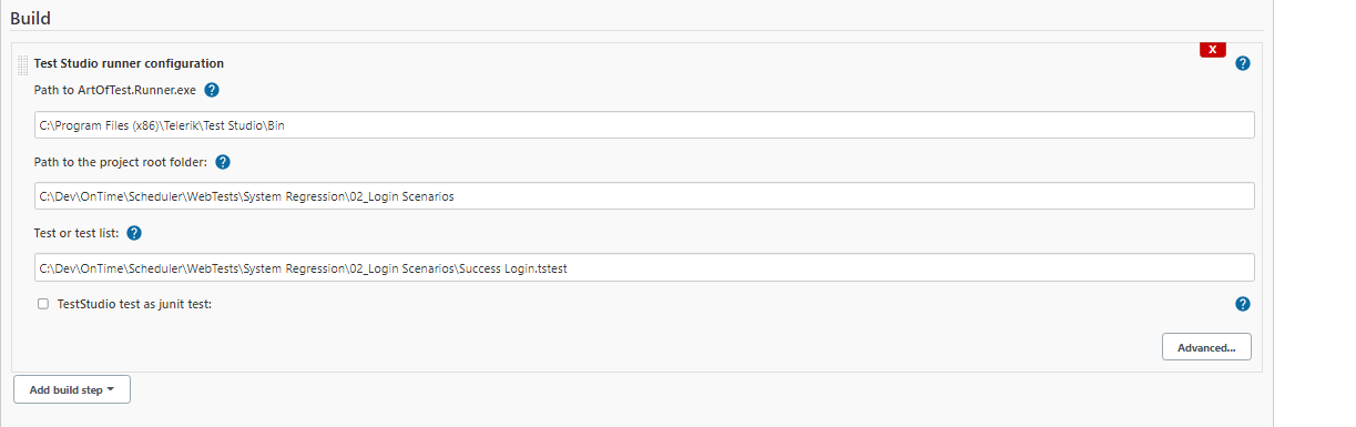 Running as SYSTEM Building on master in workspace C:\Program Files (x86)\Jenkins\workspace\02_Login Scenarios Command: "C:\Program Files (x86)\Telerik\Test Studio\Bin\ArtOfTest.Runner.exe" test="C:\Dev\OnTime\Scheduler\WebTests\System Regression\02_Login Scenarios\Success Login.tstest" root="C:\Dev\OnTime\Scheduler\WebTests\System Regression\02_Login Scenarios" out="C:\Program Files (x86)\Jenkins\workspace\02_Login Scenarios\TestStudioResults" result="TestStudioResults-1624407009049.junitstep" junitstep Command output: Error: unrecognized or incomplete command line. Unsupported argument 'junitstep'!