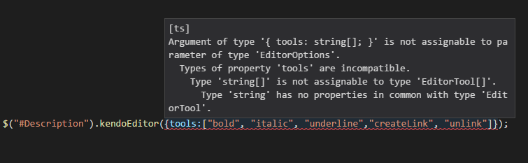 I seem to be having an issue with the JQuery Editor and customizing the tools. If I just call $("#element").kendoEditor(); everything loads with the standard toolbar. However when I try to set it up with tools options like so: $("#element").kendoEditor({tools:["bold", "italic", "underline","createLink", "unlink"]}); I get the following error in the image. Any ideas?
