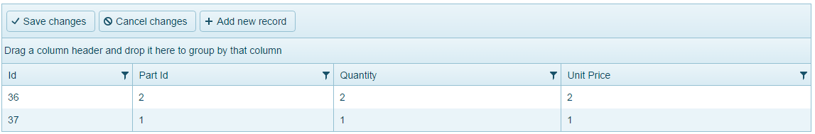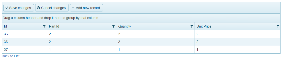 It has posted to the database just fine. I have a new line item with Id #35, part id #3, qty 3, and unit price 3, but instead it has duplicated the top record from the grid before the second posting.