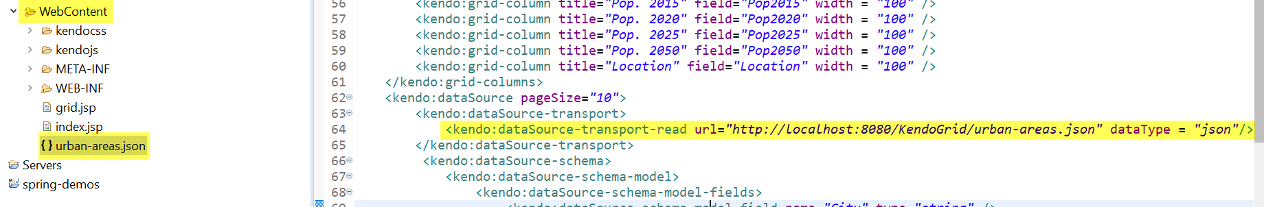 <kendo:dataSource-transport-read url="http://localhost:8080/KendoGrid/urban-areas.json" dataType = "json"/>