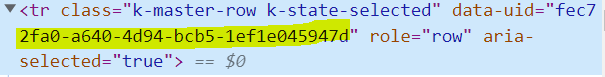 var row = grid.element.find("tr[data-uid='" + modelToSelect.uid + "']");