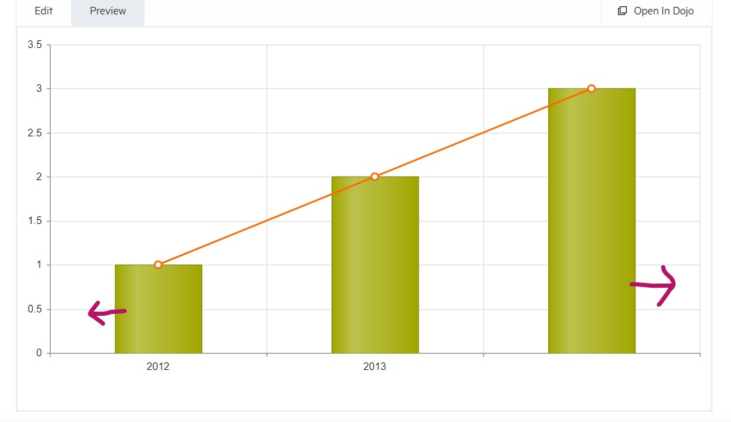 <div id="chart"></div><script>$("#chart").kendoChart({ categoryAxis: [{ justified: true, categories: ["2012", "2013"] }], series: [ { type: "line", data: [1, 2, 3] }, { type: "bar", data: [1, 2, 3] } ]});</script>