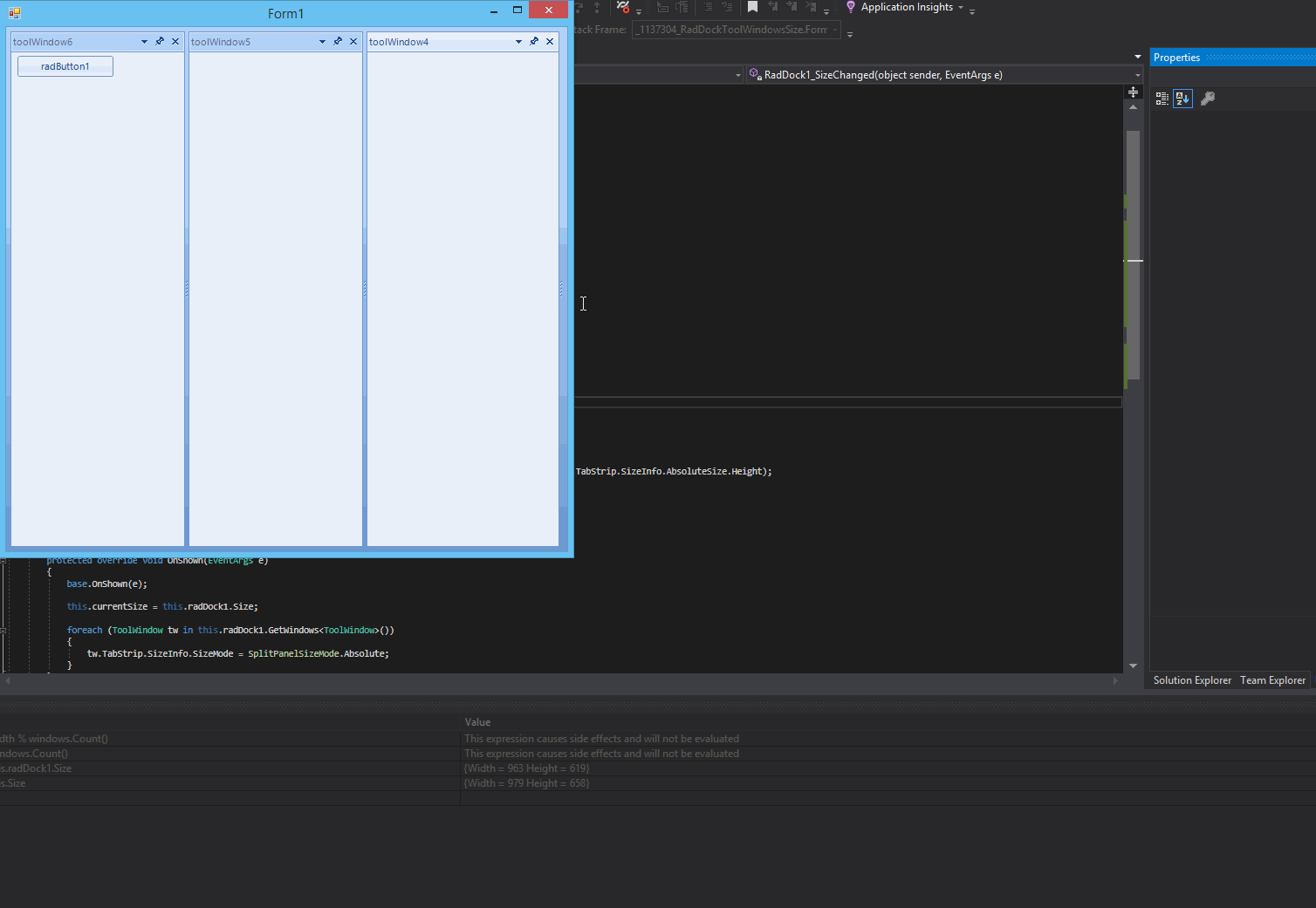 public partial class Form1 : Form{ Size currentSize; public Form1() { InitializeComponent(); this.radDock1.SizeChanged += RadDock1_SizeChanged; } private void RadDock1_SizeChanged(object sender, EventArgs e) { int width = this.radDock1.Width - this.currentSize.Width; var windows = this.radDock1.GetWindows<ToolWindow>(); if (width % windows.Count() == 0) { int x = width / windows.Count(); foreach (ToolWindow tw in windows) { tw.TabStrip.SizeInfo.AbsoluteSize = new Size(tw.TabStrip.SizeInfo.AbsoluteSize.Width + x, tw.TabStrip.SizeInfo.AbsoluteSize.Height); } this.currentSize = this.radDock1.Size; } } protected override void OnShown(EventArgs e) { base.OnShown(e); this.currentSize = this.radDock1.Size; foreach (ToolWindow tw in this.radDock1.GetWindows<ToolWindow>()) { tw.TabStrip.SizeInfo.SizeMode = SplitPanelSizeMode.Absolute; } }}Bear in mind that with this approach you will be solely responsible for the sizes of the tool windows. You can further extend it to suit best your actual setup. I am also attaching a short video showing the result on my end.