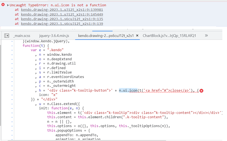 Including the above 3 works as expected. However ,when using just the individual scripts for charts rather than the whole set of library which is a huge file, the kendo.drawing.js file breaks .Attachment includes the snapshot for the error.