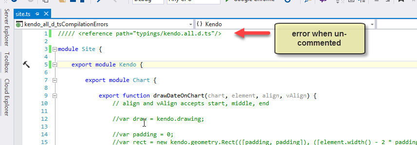 When add /// <reference path="typings/kendo.all.d.ts"/> to the site.ts file (see attached screen shot) I get the 117 mentioned errors. I would like ts function drawDateOnChart to compile (kendo.all.d.ts ref needed).