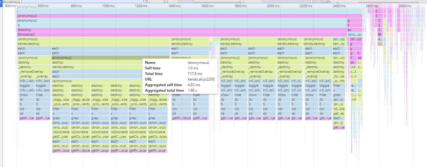 We have implemented a bunch of Angular 1 Kendo controls into our application. We have been encountering some slowness on the front end with the browser freezing when transitioning view states. I did some investigating, and was able to identify the issue as being related to the destroy methods kendo has implemented.
