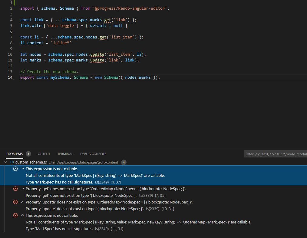Hi i have a problem about kendo angular editor. I used editor for dynamic html bind. But these htmls using bootstrap. For example one page using tabs. And html have data-toggle attribute in <a> tag. But when i use the editor this data-toggle attribute always deleted. I look at the demos i saw ProseMirror Schema title. I applied same steps and created custom schema. Everything works perfect. But when i rebuild my code from zero Angular shown me the errors. I research the error but not find anything. I added the error pics. Can anyone help me?
