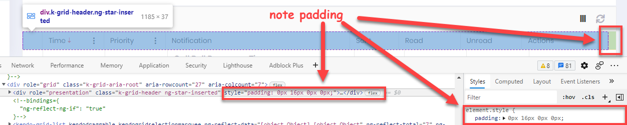 The grid header is now rendered with 16px padding which throws out the alignment of all columns with the header. It looks like the padding has been added by flex and I am unable to overwrite. I can manually modify right padding to 0px in the console and all is great.