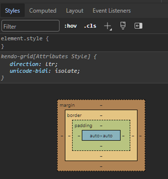 When I inspect a Kendo UI component, like kendo-grid, in dev tools, no CSS is displayed. I can see that there are css classes applied to the component, k-grid and k-grid-md, but there's nothing displayed in dev tools for those css classes. I verified that I can create my own component, put it on my home component (as I've done with Kendo UI components), apply css classes to it and that css shows up in dev tools as I expect when I inspect it. So it only appears that I can't see the css for Kendo UI components. What do I need to do to get the css to show up?