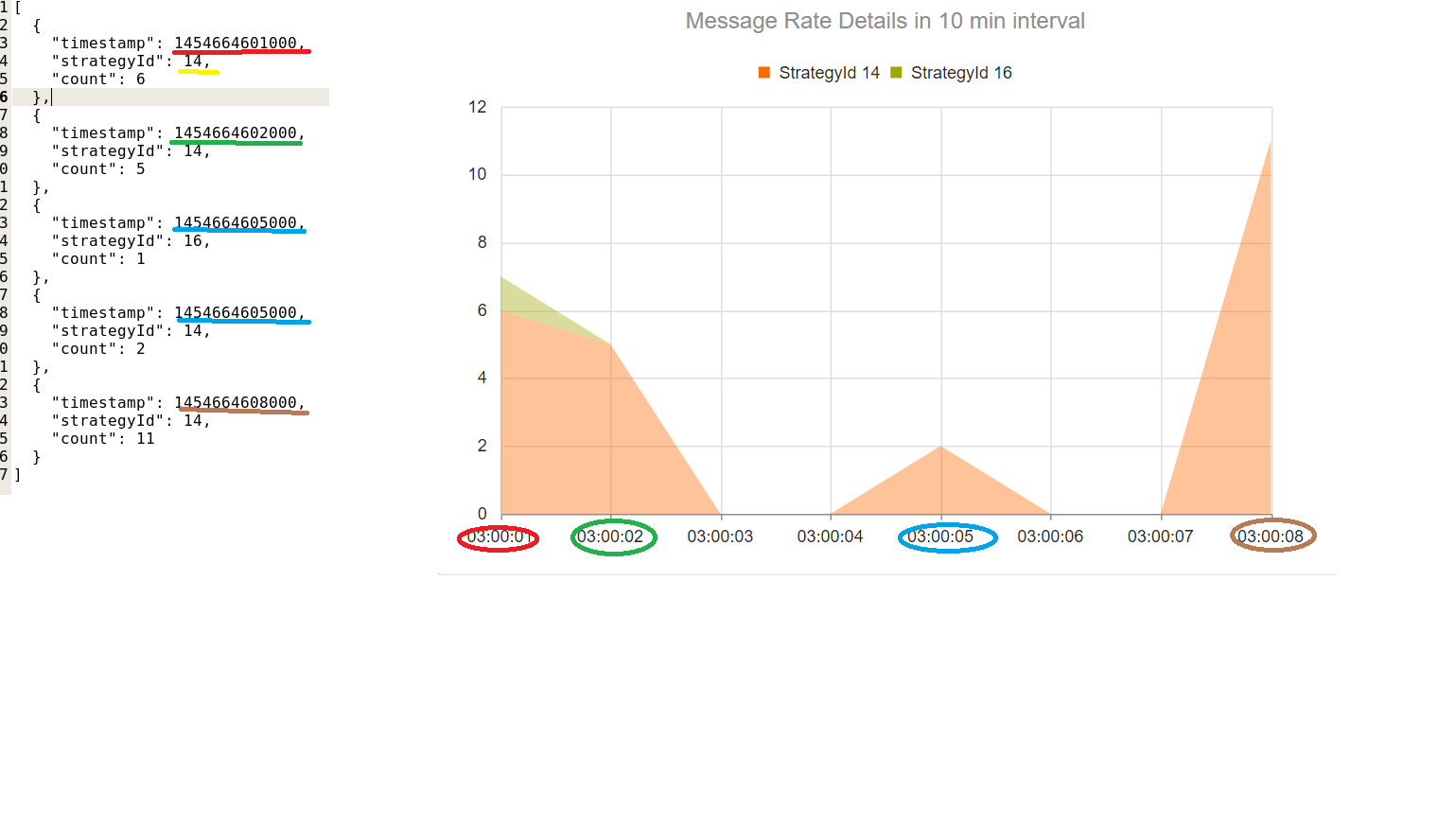 var messageRateData = new kendo.data.DataSource({ transport: { read: { url: "content/shared/message-rate-details.json", dataType: "json" } }, sort: { field: "timestamp", dir: "asc" }, group: { field: "strategyId" } });$("#chart10").kendoChart({ dataSource: messageRateData, title: { text: "Message Rate Details in 10 min interval" }, legend: { position: "top" }, series: [{ type: "area", stack: true, field: "count", name: "StrategyId #= group.value #" }], valueAxis: { labels: { format: "{0}" }, line: { visible: false } }, categoryAxis: { field: "timestamp", type: "date", labels: { format: "hh:mm:ss" } }, tooltip: { visible: true, format: "{0}" }});However to my utter surprise I find that the data points is not displayed correctly for the first data-point. i.e. "03:00:01" for the given StrategyId.