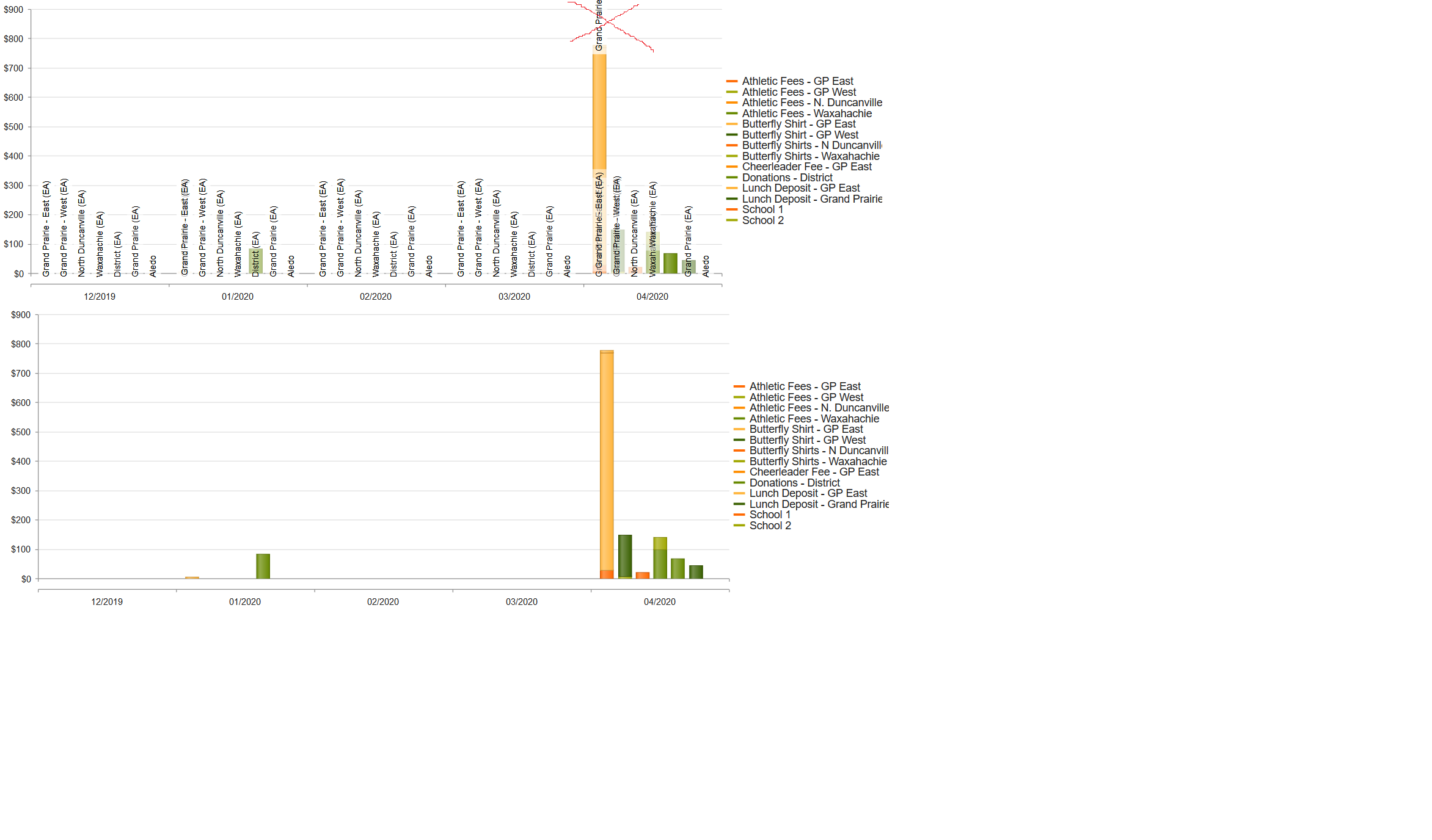 @(Html.Kendo().Chart<RevenueSummaryViewModel> () .Name("RevenueSummaryChart") .Legend(legend => legend.Visible(true).Labels(l => l.Font("10px")).Position(ChartLegendPosition.Right).Padding(0, 15, 0, 0)) .SeriesDefaults(sd => sd.Bar()) .Events(ev => ev.DataBound("SetSeriesStack")) .Series(series => { series.Column(model => model.TotalAmount) .Field("TotalAmount") .CategoryField("MonthAndYear") .CategoryAxis("DateAxis") .Name("#=group.value#") .Labels(x => x.Position(ChartBarLabelsPosition.InsideBase).Visible(false).Template("#=dataItem.ActivityLocation#").Rotation(-90).Margin(10, 0, 0, 0)) .Tooltip(t => t.Visible(true).Template("<div style='text-align:left;'>#=series.name#<br />Total: #=kendo.toString(value, 'c')#<br />Records: #=dataItem.RecordCount#<br />Activity Center: #=dataItem.ActivityCenter#</div>")); }) .CategoryAxis(x => x.Name("LocationAxis").Labels(z => z.Rotation(-90))) .CategoryAxis(x => x.Name("DateAxis")) .ValueAxis(x => x.Numeric().Labels(l => l.Format("{0:c0}")).Name("AmountAxis")) .DataSource(ds => ds.Read(rd => rd.Action("GetRevenueSummary", "Revenue").Data("SendSelectedLocationId")).Group(grp => grp.Add(add => add.ActivityCenter))) )