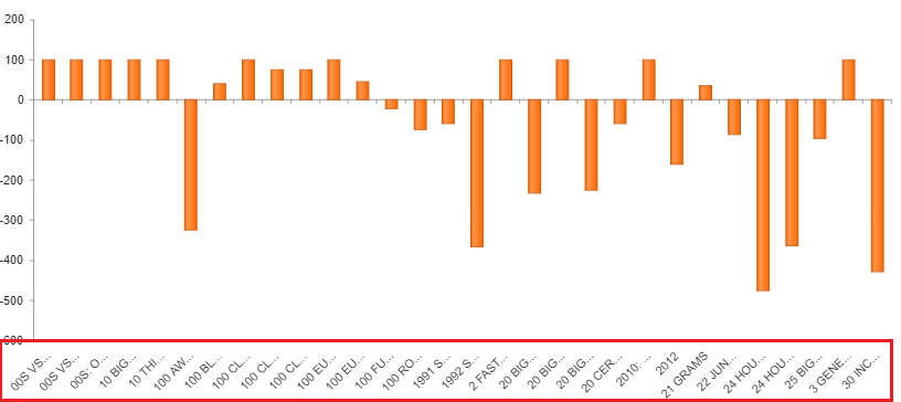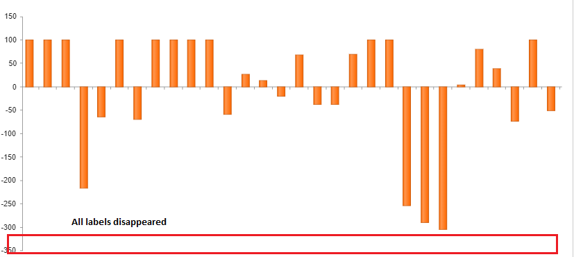 I have created a bar chart which has data of about thousand objects. Objects have both positive and negative values. When the chart is initially rendered all the labels are displayed properly. If there are only positive or only negative values and even when I scroll along Y axis, then labels are clearly seen for all the bars. But if both positive and negative values are there in the chart and as I scroll along Y axis, labels start disappearing. I don't understand why such behaviour is seen. I am not using any custom function to render labels. Just