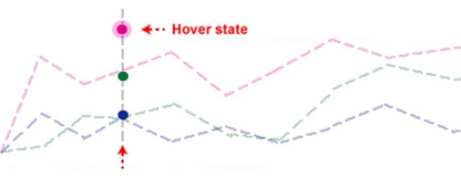 We have a multi plot line chart where we have default circle markers with white background, which works fine. But when 2 plots intersect at a point hovering to find the correct tooltip is a problem.So we can with the design to stop showing the marker circles and a show a horizontal dotted line moving with the mouse. When we come upon a category axis label 3 bubbles/dots corresponding to the three plots should appear on it, not on the series plot itself (as 2 plots are coinciding). They should appear at fixed height intervals and on hover should how a bubble glow effect and the corresponding tooltip should come. Now can this be done.
