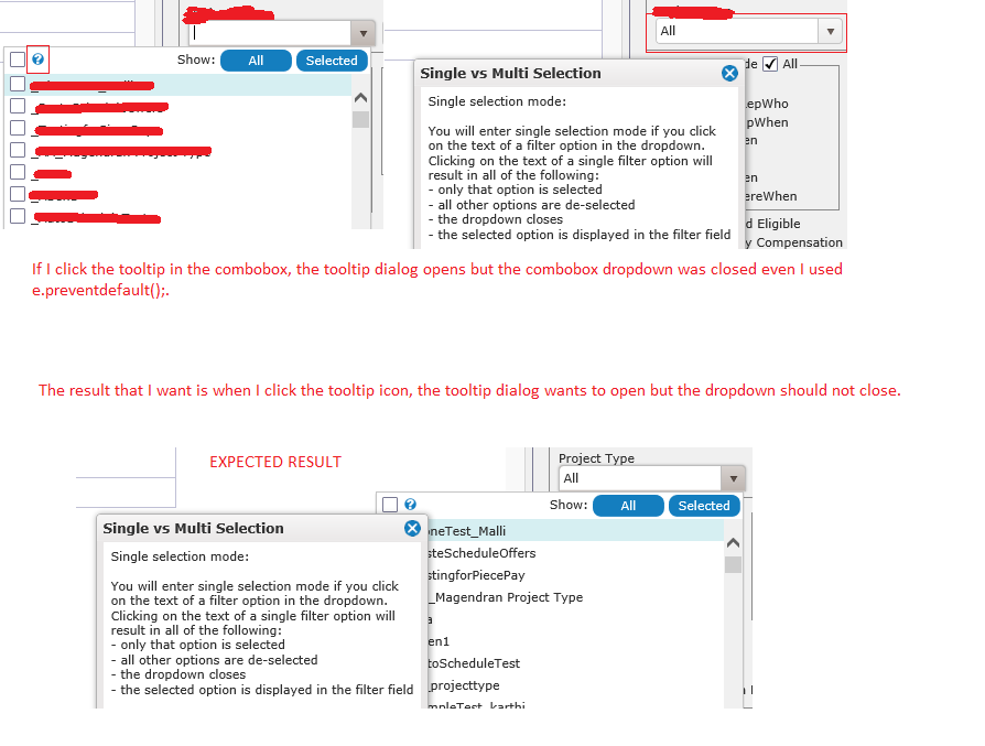 The tooltip was shown in the dialog and we just call the tooltip from outside of the combobox so when I click the tooltip it act as a separate click event function only.