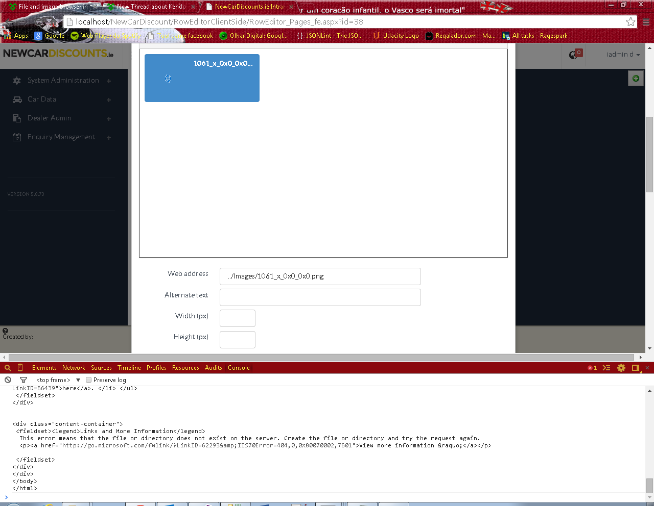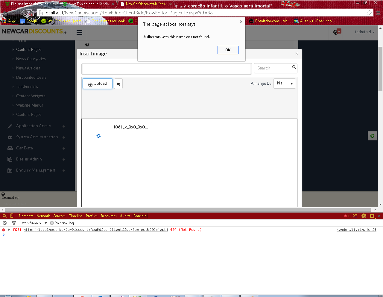 $("#ContentOfPage").kendoEditor({ tools: [ "insertImage" ], imageBrowser: { messages: { dropFilesHere: "Drop files here" }, transport: { read: { dataType: "json", contentType: 'application/json; ', type: "GET", url: findRelativeBasePath() + "WebServices/Actions/Pages_fe_actions.svc/Pulls_Pages_fe" }, create: { type: "POST", url: findRelativeBasePath() + "WebServices/Actions/Pages_fe_actions.svc/Push_Pages_fe", data : {"name":"111.JPG","type":"f","size":"6832"} }, thumbnailUrl: { url: findRelativeBasePath() + "WebServices/Actions/Pages_fe_actions.svc/Push_Pages_fe", data : { formValues : ""} }, uploadUrl: { type: "POST", url: findRelativeBasePath() + "WebServices/Actions/Pages_fe_actions.svc/Push_Pages_fe" , data : { formValues : ""} }, imageUrl: "../Images/{0}", path: "../Images/" } } });