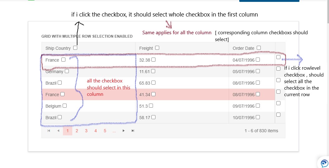 If suppose i click first column checkbox, it should select only first column data checkboxs, same applicable for all columns and also need row level selection too.