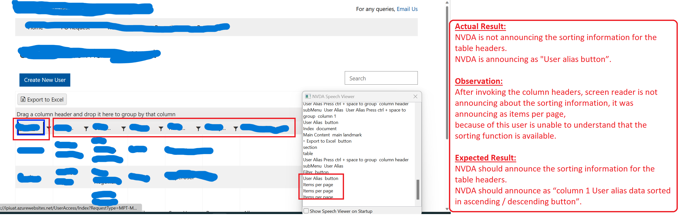 NVDA Screen reader is not announcing the sorting information for the table headers.