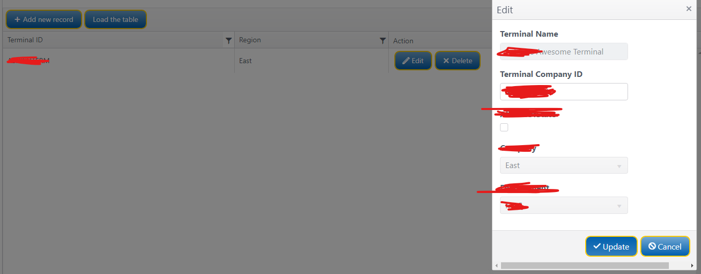 @(Html.Kendo().Grid<ProjectName.TerminalOutOfState>().Name("manageTOSSqlRecordsGrid").Columns(columns =>{ columns.Bound(c => c.TerminalOutOfStateID).Hidden(); columns.Bound(c => c.TerminalCompanyID).Title("Terminal ID").Width(60); columns.Bound(c => c.CompanyID).Title("Region").ClientTemplate("#=CompanyName#").Width(40); columns.Command(cmd => { cmd.Edit(); cmd.Destroy(); cmd.Custom("Save").Visible("showSaveCommand").Click("saveTerminalRow"); }).Title("Action").Width(80);}).ToolBar(tbr =>{ tbr.Create(); tbr.Custom().Text("Load the table");}).Editable(edt => edt.Mode(GridEditMode.PopUp).TemplateName("TOoSTemplate").CreateAt(GridInsertRowPosition.Top)).DataSource(dataSrc => dataSrc .Ajax() .ServerOperation(true) .PageSize(15) .Model(mdl => mdl.Id(column => column.TerminalOutOfStateID)) .Create(update => update.Action("UpsertTerminalOoSRecordAsync", "Configuration")) //omitted for brevity).AutoBind(false))