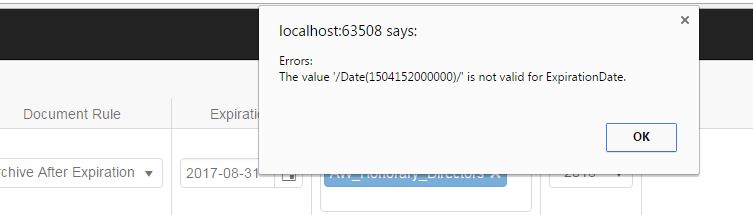 "The value /'Date(1504152000000)' is not valid for ExpirationDate" (See attached screen shot).