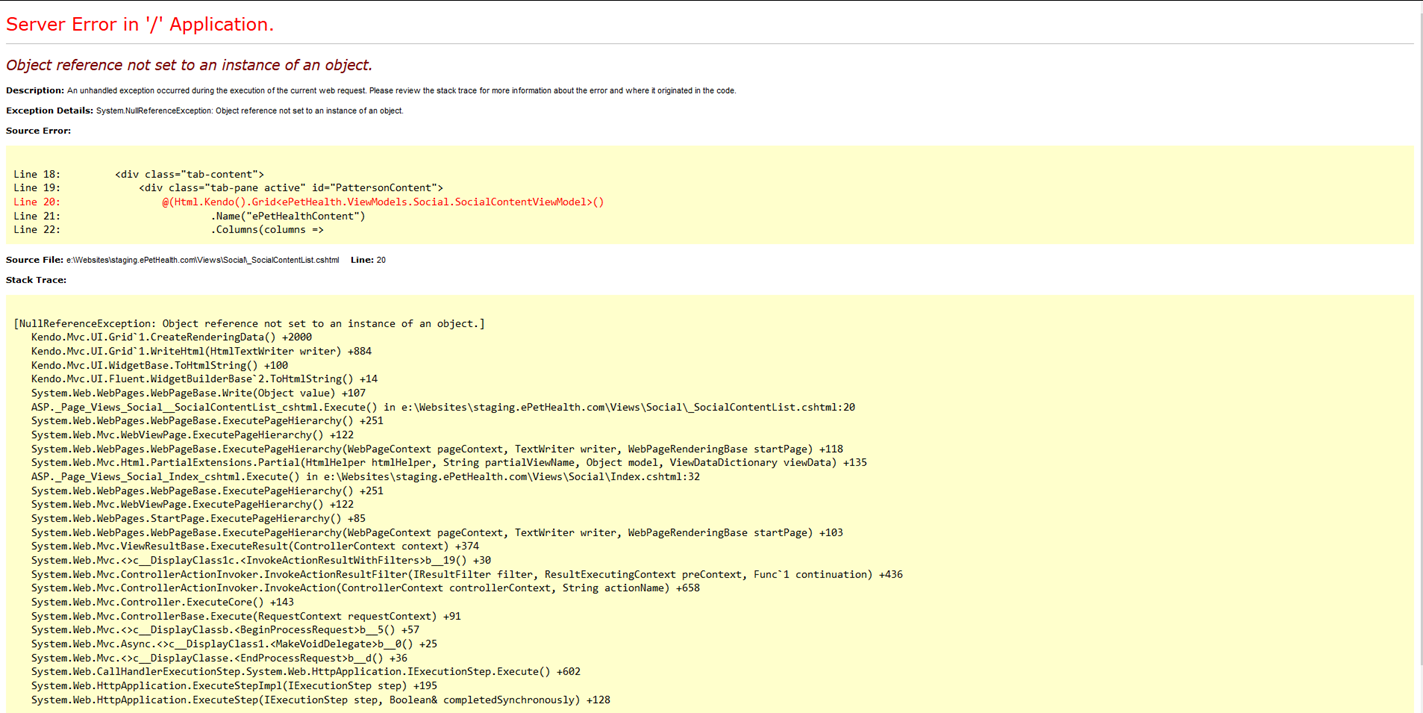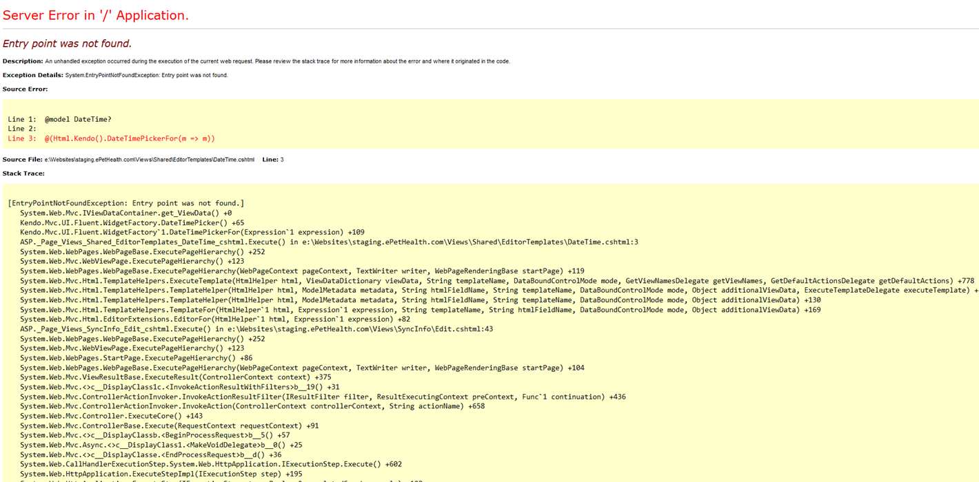 We are using Kendo.Mvc.Dll with our web page and we are running into some issue. We are receiving errors on two of our pages and can't figure out why it is failing. The following is the situation: