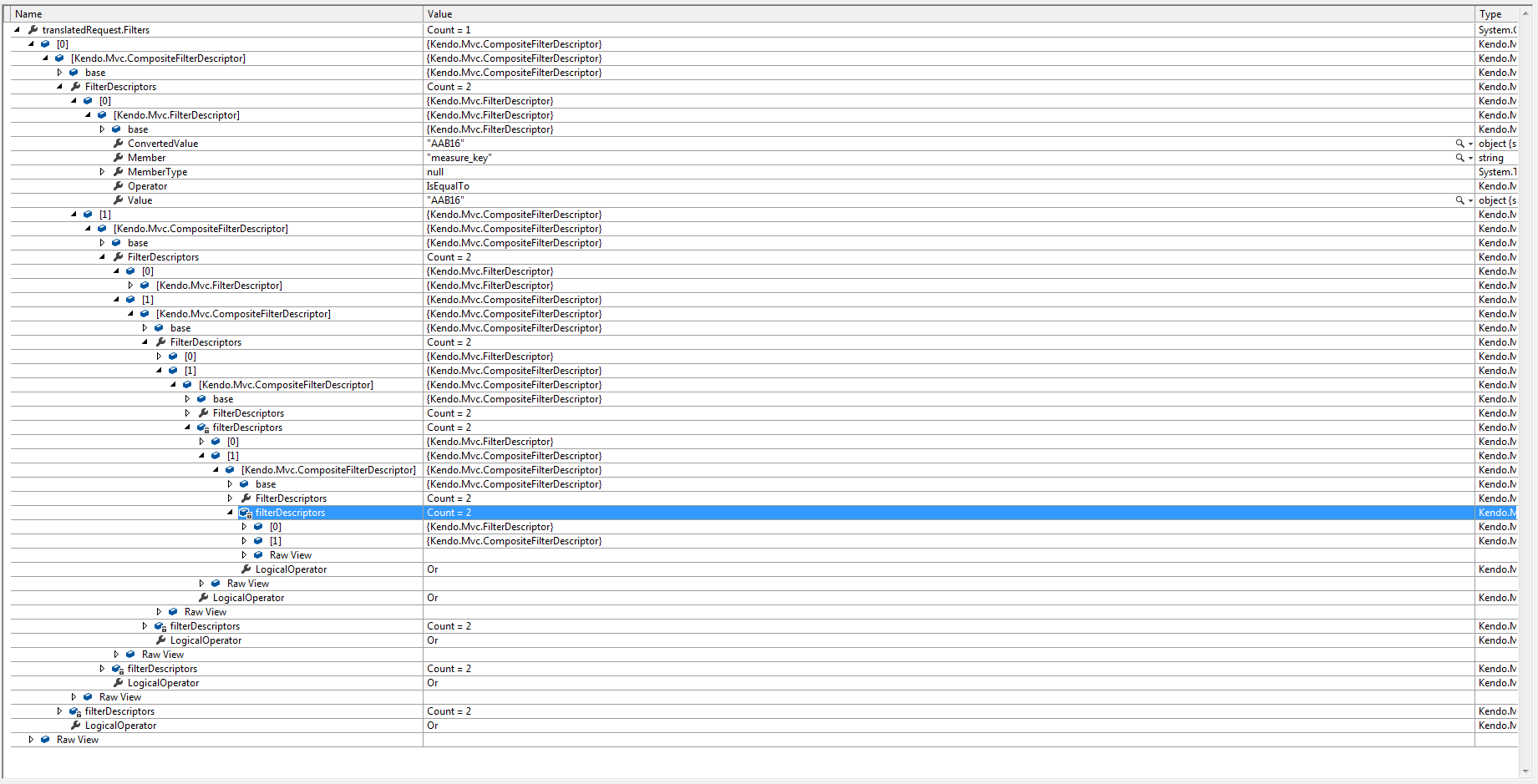 01.self.onSchemaPopulated = function (columns, model) {02. 03. var measureKey = _.find(columns, function(item) {04. return item.field === 'measure_key';05. });06. 07. measureKey.filterable =08. {09. extra: false,10. operators: {11. string: { 12. eq: "Is equal to" 13. }14. },15. ui: self.measureKeyFilter 16. };17. 18. };19. 20. self.measureKeyFilter = function (element) {21. 22. element.removeAttr("data-bind");23. 24. var menu = $(element).parent();25. 26. menu.find(".k-filter-help-text").text("Show records for measure keys in:");27. menu.find("[data-role=dropdownlist]").remove();28. 29. var multiSelect = element.kendoMultiSelect({30. dataBound: function (e) {31. e.sender.tagList.addClass('k-full-button');32. e.sender.ul.addClass('k-multiselect-items');33. },34. dataSource: _.invoke(self.itemSelected().measures(), 'measure_key'),35. tagMode: 'single',36. tagTemplate: '<div>#:values.length# measures selected...</div>',37. value: _.invoke(self.itemSelected().checkedMeasures(), 'measure_key'),38. }).data("kendoMultiSelect");39. 40. menu.find("[type=submit]").on("click", { widget: multiSelect }, self.filterByMeasureKey);41. 42. };43. 44. self.filterByMeasureKey = function (e) {45. 46. var newFilter = { logic: "and", filters: [] };47. var measureFilter = null;48. var values = e.data.widget.value();49. 50. if (values.length !== self.itemSelected().measures().length) {51. 52. measureFilter = { logic: "or", filters: [] };53. 54. $.each(values, function (i, v) {55. measureFilter.filters.push({ field: "measure_key", operator: "eq", value: v });56. });57. 58. newFilter.filters.push(measureFilter);59. 60. };61. 62. var grid;63. 64. if (self.isRelationshipSummaryToggled()) {65. grid = $('#' + self.rsOptions.id).data("kendoGrid");66. } else {67. grid = $('#' + self.rdOptions.id).data("kendoGrid");68. };69. 70. var currentFilters = grid.dataSource.filter();71. 72. if (!isNull(currentFilters)) { 73. 74. _.each(currentFilters.filters, function (x) { 75. 76. if (!_.isArray(x.filters)) {77. newFilter.filters.push(x);78. } else if (x.filters[0].field !== 'measure_key') {79. newFilter.filters.push(x);80. };81. 82. }); 83. 84. }; 85. 86. grid.dataSource.filter(newFilter);87. 88. };