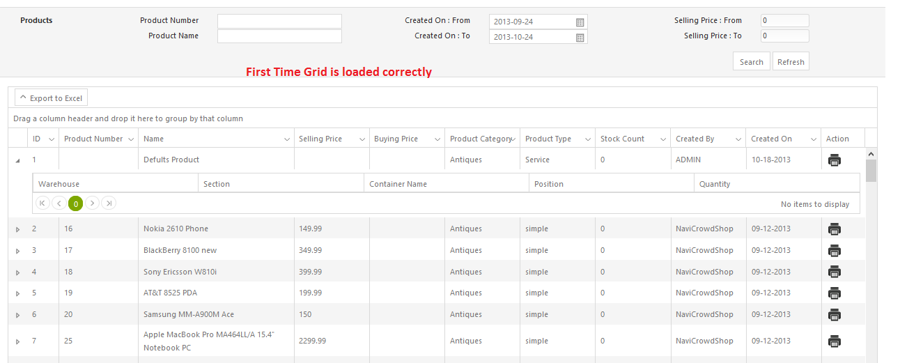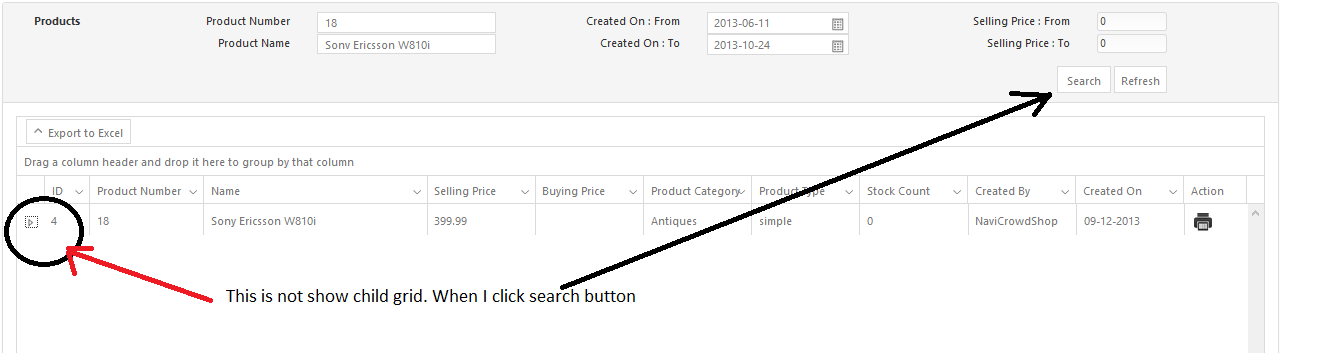 when click search button I reload data to my grid. But Its not show child grid data. I attached my aspx page and a page print.