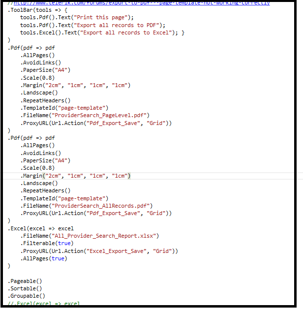 @(Html.Kendo().Grid<ProviderResults>() .Name("grdProviderSearchReport") .Columns(c => { //(column info removed) }) .Groupable() .Reorderable(reorder => reorder.Columns(true)) .Filterable() .ToolBar(tools => { tools.Pdf().Text("Print this page"); tools.Pdf().Text("Export all records to PDF"); tools.Excel().Text("Export all records to Excel"); } ) .Pdf(pdf => pdf .AllPages() .AvoidLinks() .PaperSize("A4") .Scale(0.8) .Margin("2cm", "1cm", "1cm", "1cm") .Landscape() .RepeatHeaders() .TemplateId("page-template") .FileName("ProviderSearch_PageLevel.pdf") .ProxyURL(Url.Action("Pdf_Export_Save", "Grid")) ) .Pdf(pdf => pdf .AllPages() .AvoidLinks() .PaperSize("A4") .Scale(0.8) .Margin("2cm", "1cm", "1cm", "1cm") .Landscape() .RepeatHeaders() .TemplateId("page-template") .FileName("ProviderSearch_AllRecords.pdf") .ProxyURL(Url.Action("Pdf_Export_Save", "Grid")) ) .Excel(excel => excel .FileName("All_Provider_Search_Report.xlsx") .Filterable(true) .ProxyURL(Url.Action("Excel_Export_Save", "Grid")) .AllPages(true) ) .Pageable() .Sortable() .Groupable() .Pageable(pageable => pageable .Refresh(true) .ButtonCount(3)) .Events(events => events .DataBound("onGridDataBound") ) .DataSource(d => d.Ajax() .PageSize(12) .Model(m => m.Id(r => r.ProviderId)) .Read(read => read.Action("ProviderSearchReportGridData", "ProviderReports").Data("ProviderSearchViewModelData")) .Sort(sort => sort.Add("ProviderId").Ascending()) )//.HtmlAttributes(new { style = "height:500px;" }))