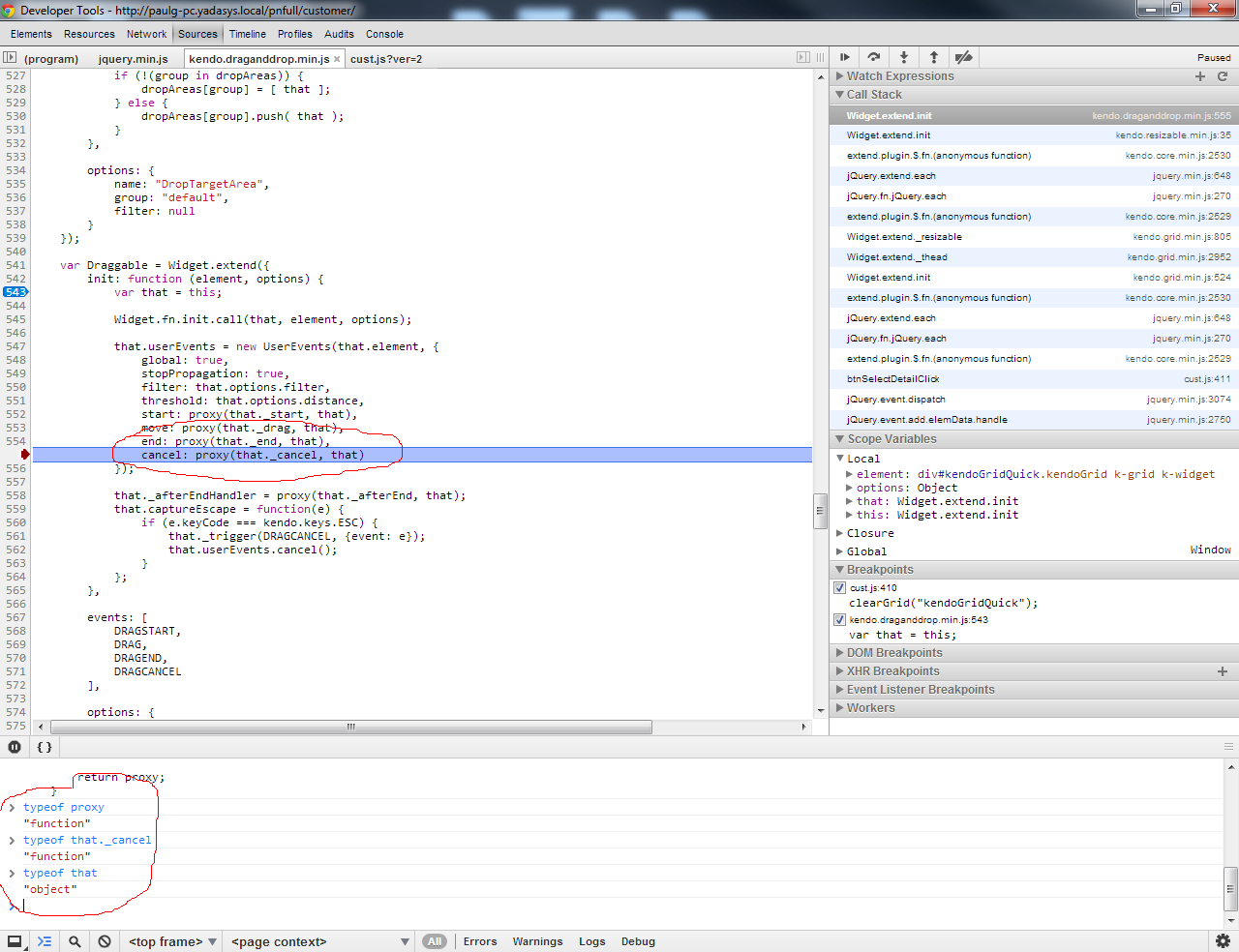 - The error happens at line 555 where the new object is receiving the cancel property.