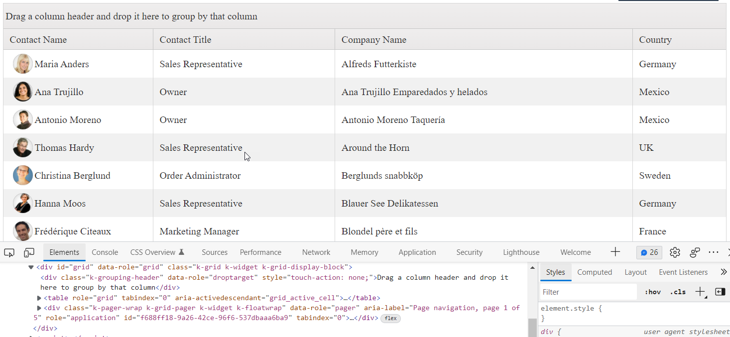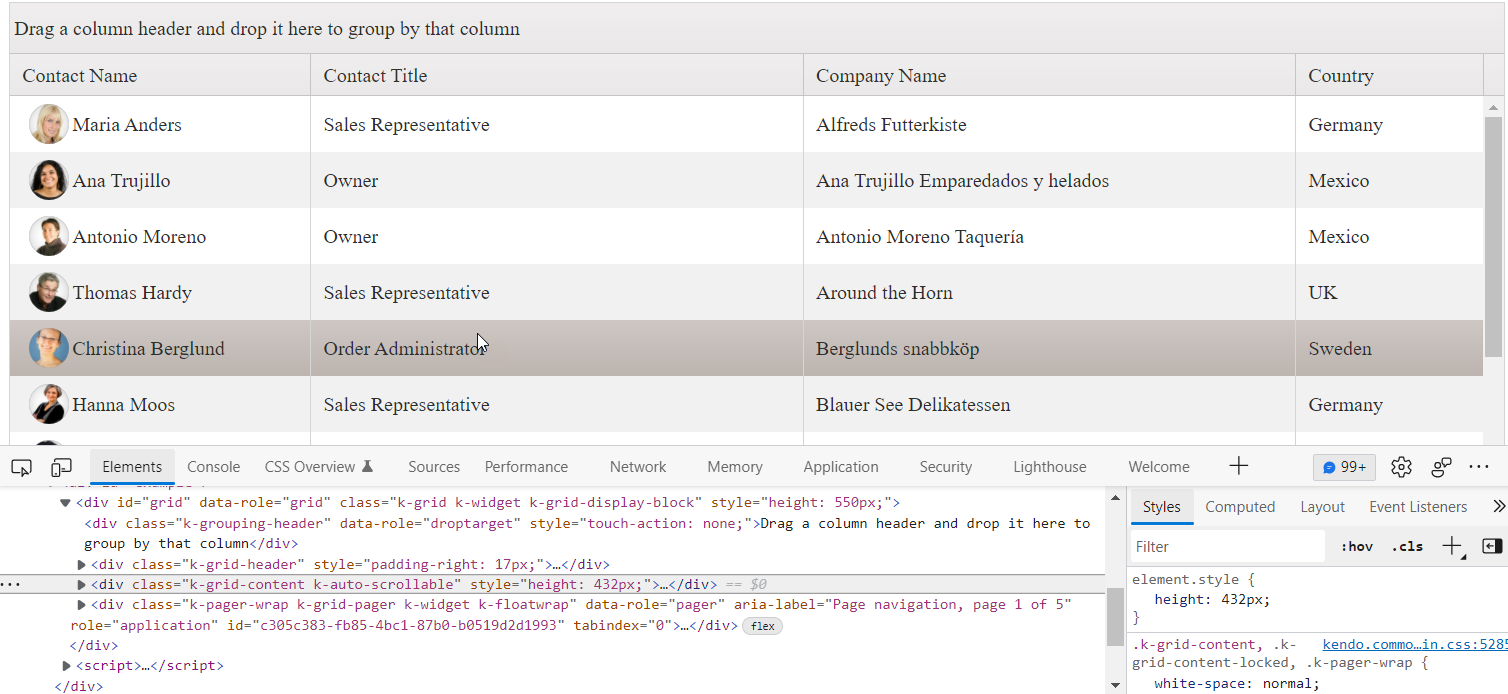</div>so for the first customer, the <divs> containing the k-grid-header and k-grid-content are ignored and replaced by <table> element.
