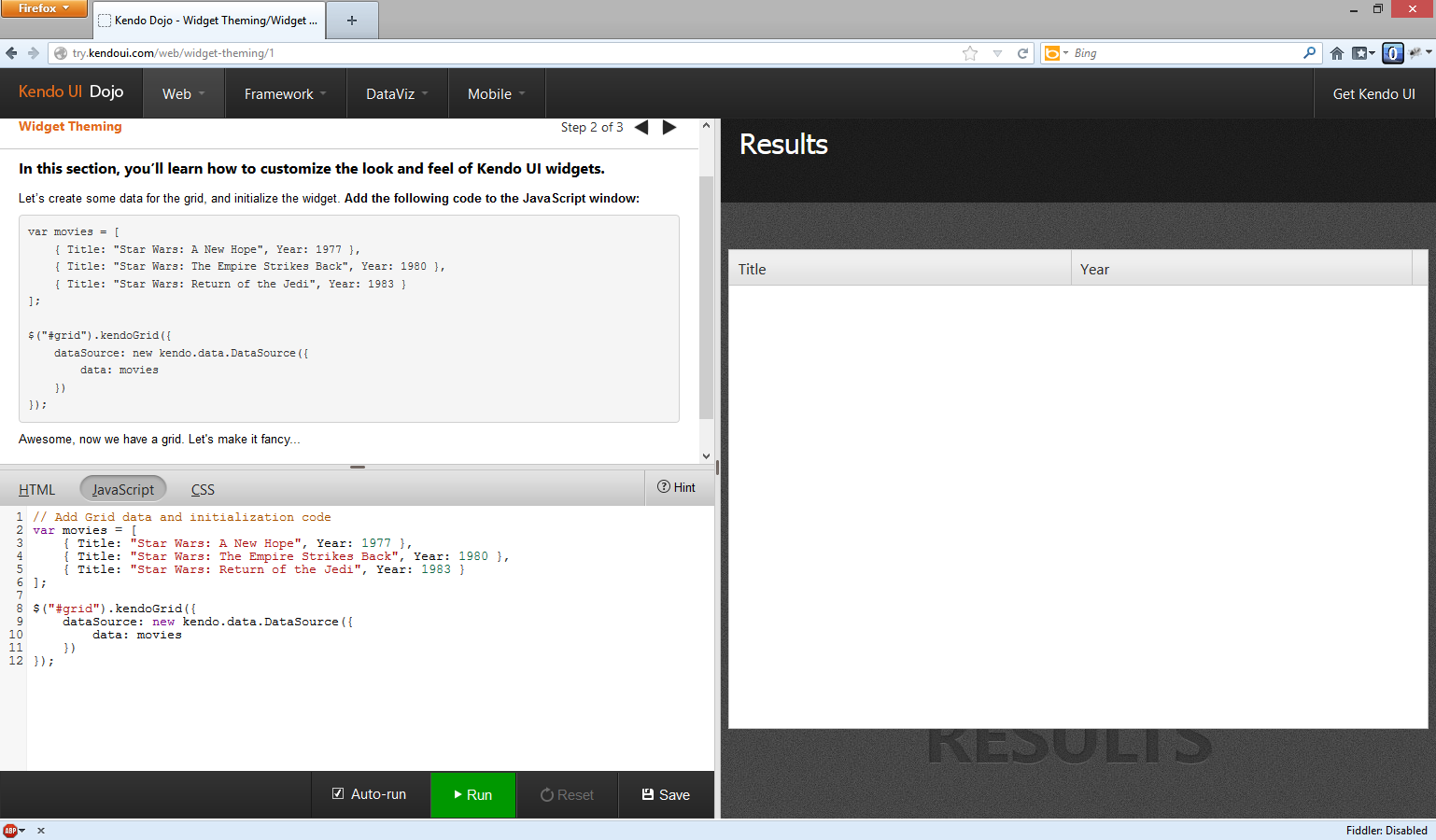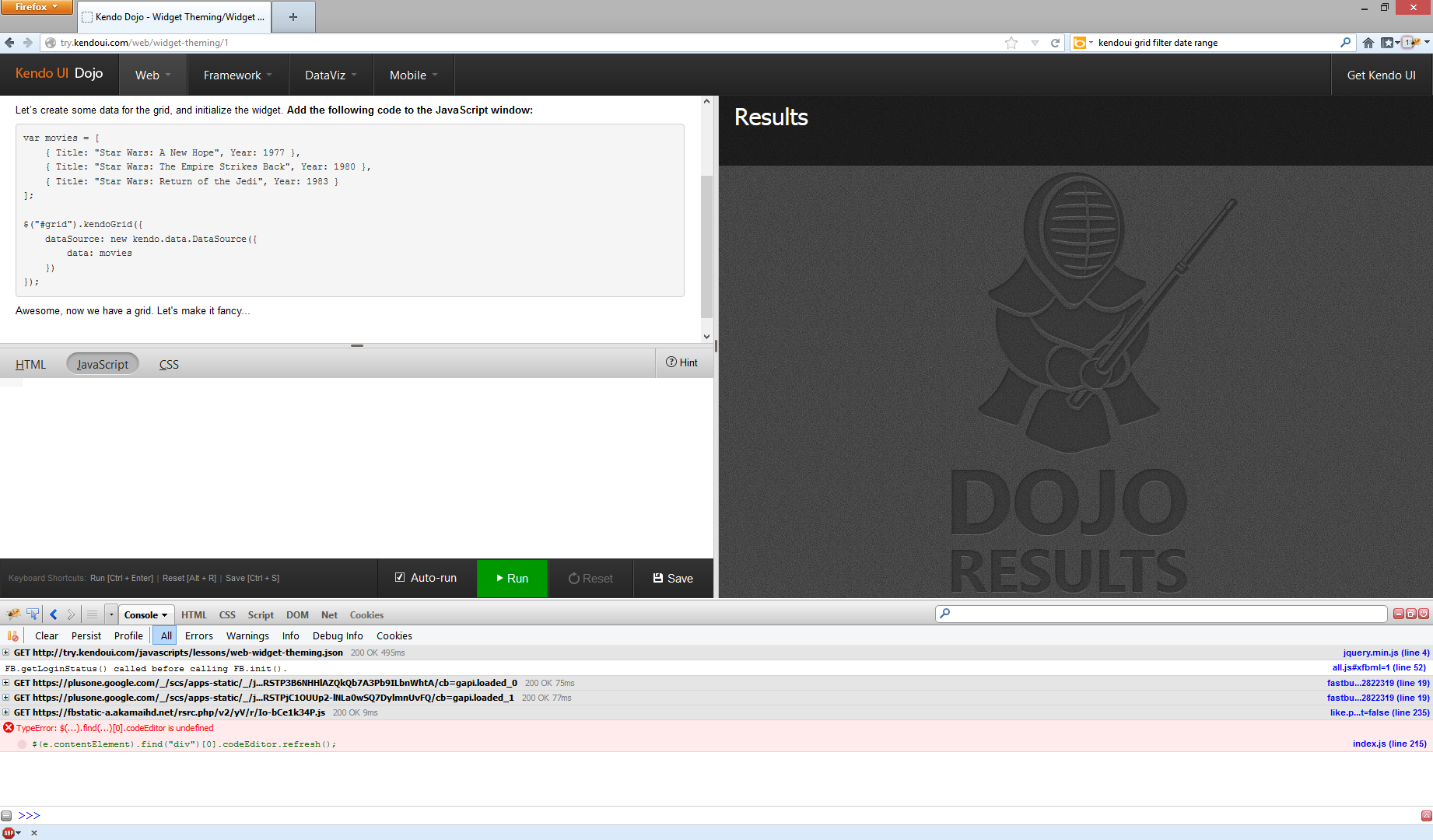 Today I was working through adding a Kendo Grid to my project when I noticed that the Kendo Grid is not showing the row values. First I thought I was something messed up on my side but then I noticed the same behavior on the Kendo Dojo site.