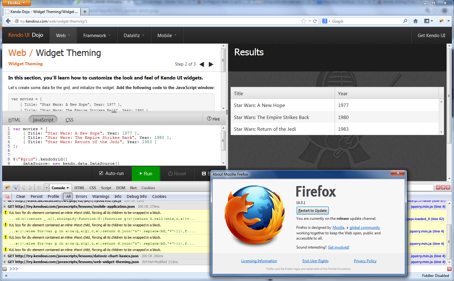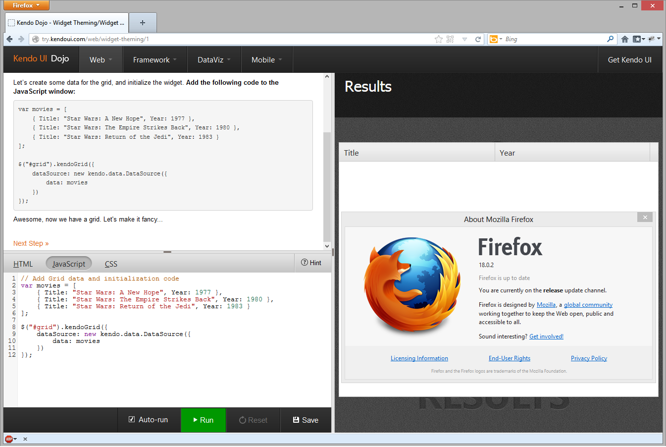 I just tried to duplicate this issue on Windows 8 with Firefox 18 and was not able to do so with either Dojo lesson that uses the Grid (Web / Widget Theming & Framework / DataSource). Can you confirm that you're running the latest version of Firefox (18.0.2) and that this issue happens when you follow the steps exactly as described in the script?