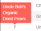 <ng-template #template let-anchor> <ng-container *ngIf="anchor.nativeElement.getAttribute('id')"><span>ID: {{ anchor.nativeElement.getAttribute("id") }}</span><br /></ng-container> <ng-container *ngIf="anchor.nativeElement.getAttribute('prname')"><span>Name: {{ anchor.nativeElement.getAttribute("prname") }}</span><br /></ng-container> <ng-container *ngIf="anchor.nativeElement.getAttribute('price')"><span>Price: {{ anchor.nativeElement.getAttribute("price") }}</span><br /></ng-container> <ng-container *ngIf="anchor.nativeElement.getAttribute('quantity')"><span>Quantity: {{ anchor.nativeElement.getAttribute("quantity") }}</span><br /></ng-container> </ng-template>Entries are displayed only if the SPAN element, used in the Grid template has the respective custom attributes. Thus the Tooltip for the first column displays the Name, Price, and Quantity: