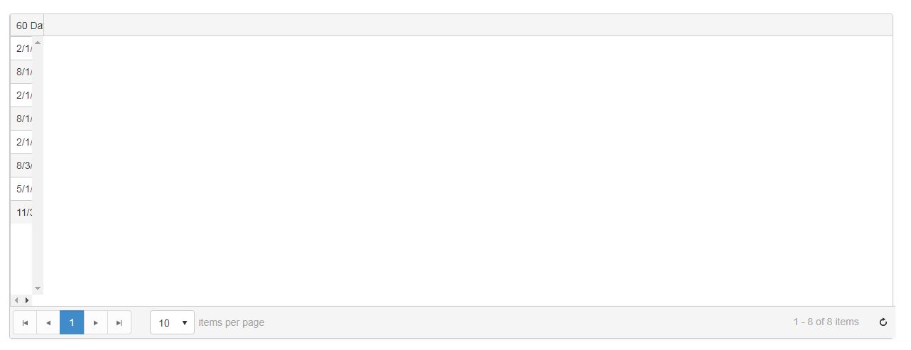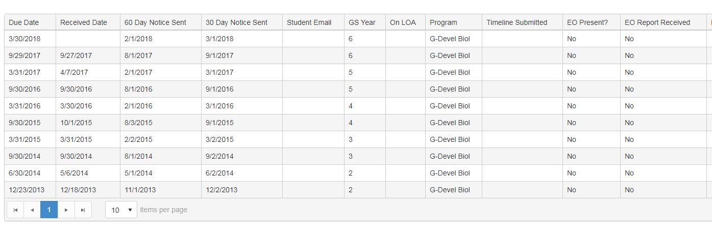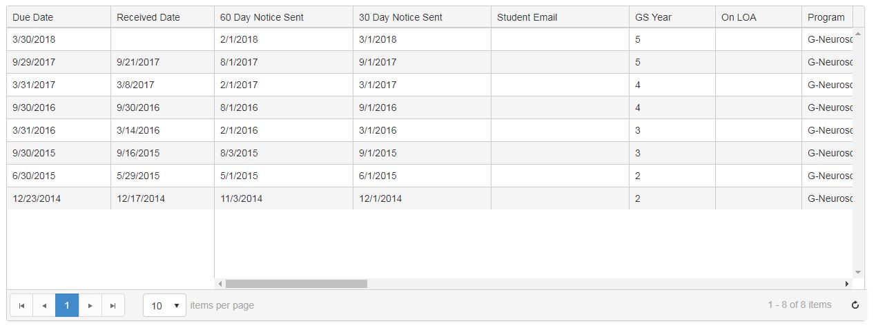 @(Html.Kendo().Grid<BCM.CurriculumSchedule.Web.Models.StatusReports.StudentProfileHistory>() .Name("List") .Columns(columns => { columns.Bound(u => u.DueDate).Locked(true).Lockable(false).Title("Due Date"); columns.Bound(u => u.ReceivedDate).Locked(true).Title("Received Date"); columns.Bound(u => u.TwoMonthNoticeSent).Locked(true).Title("60 Day Notice Sent"); columns.Bound(u => u.OneMonthNoticeSent).Title("30 Day Notice Sent"); columns.Bound(u => u.StudentEmailAddress).Title("Student Email"); columns.Bound(u => u.GSYear).Title("GS Year"); columns.Bound(u => u.OnLOA).Title("On LOA"); columns.Bound(u => u.Program).Title("Program"); columns.Bound(u => u.TimeLineSubmitted).Title("Timeline Submitted"); columns.Bound(u => u.AdHocMemberPresent).Title("EO Present?"); columns.Bound(u => u.AdHocMemberReport).Title("EO Report Received"); columns.Bound(u => u.PermissionToWriteGiven).Title("Permission Given?"); columns.Bound(u => u.PermissionToWriteDate).Title("Date Permission Given"); columns.Bound(u => u.SevenYrExtensionGranted).Title("7Yr Ext Granted?"); columns.Bound(u => u.SevenYrEffectiveDate).Title("Effective Date"); columns.Bound(u => u.DefenseDate).Title("Defense Date"); columns.Bound(u => u.ExtensionGranted).Title("Dean Ext Granted?"); columns.Bound(u => u.ExtensionDateGranted).Title("Ext Date Granted"); columns.Bound(u => u.MentorName).Title("Mentor Name"); columns.Bound(u => u.MentorEmail).Title("Mentor Email"); columns.Bound(u => u.MentorNotificationSentDate).Title("Mentor Notification Sent On"); columns.Bound(u => u.ProgramAdminEmail).Title("Program Administrator Email"); columns.Bound(u => u.PANotificationSentDate).Lockable(false).Title("Program Administrator Notification Sent On"); }) .Pageable(pageable => pageable .Refresh(true) .PageSizes(true) .ButtonCount(5)) .DataSource(dataSource => dataSource .Ajax() .Read(read => read.Action("StudentProfileHistoryData", "StatusReports", new { id = Model.StudentId })) .PageSize(10) ) )