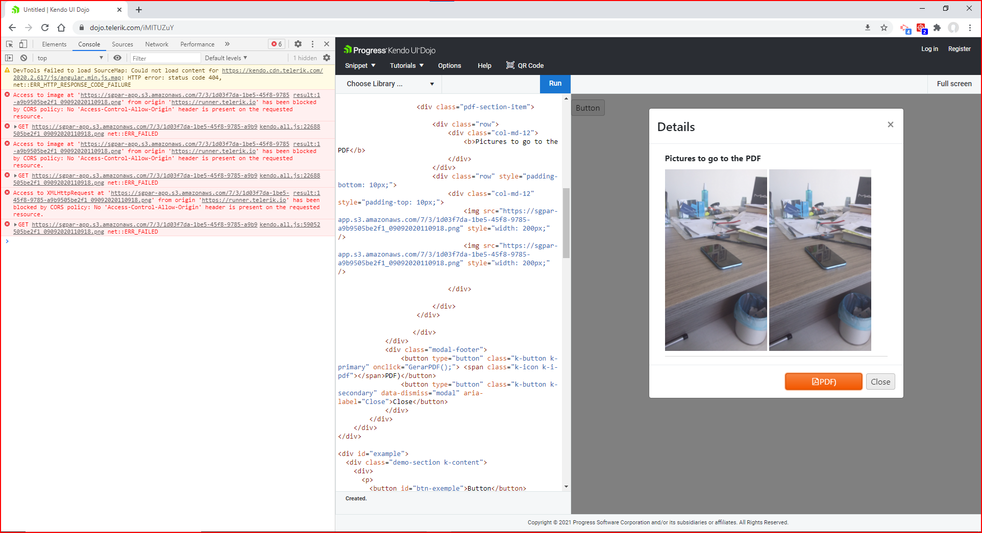 I am facing an issue where the PDF Export is, apparently, not working properly neither with MS Edge (88.0.705.53) nor on Chrome ( 88.0.4324.104 ), but is working fine on Firefox (84.0.1). When I try to generate the PDF with pictures that are stored on AWS S3 it throws CORS' errors to the Edge/Chrome console as you can see by the attached picture. When I generate the PDF from Firefox it works like charm.