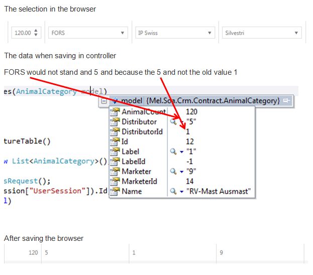 function loadTable() { var dataSource = new kendo.data.DataSource({ transport: { read: { url: "/Customer/LoadOperatingPictureTable", dataType: "json", type: "POST", contentType: "application/json; charset=utf-8", data: {} }, update: { url: "/Customer/UpdateAnimalValues", dataType: "json", type: "POST", contentType: "application/json; charset=utf-8" }, parameterMap: function (data, operation) { if (operation !== "read") { return JSON.stringify({ model: data }); } } }, autoSync: false, schema: { model: { id: "Id", fields: { Id: { editable: false, nullable: true }, Name: { editable: false }, AnimalCount: { type: "number", validation: { required: { message: "Das Feld darf nicht leer sein!" } } }, Distributor: { editable: true }, Label: { editable: true }, Marketer: { editable: true } } } }, error: function (e) { alert(e.status + ' ' + e.statusText); } }); $("div#operatingPictureTable").kendoGrid({ dataSource: dataSource, scrollable: true, sortable: true, editable: "inline", columns: [ { field: "Name", title: "Tierkategorie" }, { field: "AnimalCount", title: "Anzahl Tiere", template: '<div style="text-align: right">#= AnimalCount #</div>', width: 80 }, { field: "Distributor", title: "Lieferant", editor: onDrpDistributor }, { field: "Label", title: "Label", editor: onDrpLabel }, { field: "Marketer", title: "Vermarkter", editor: onDrpMarketer }, { command: "edit", titel: " ", width: 110 } ], }); function onDrpDistributor(container, options) { $('<input name="Distributors" data-bind="value:' + options.field + '"/>') .appendTo(container) .kendoDropDownList({ dataTextField: "Value", dataValueField: "Id", autoBind: false, dataSource: new kendo.data.DataSource({ transport: { read: { url: "/Main/GetDistributors", dataType: "json" }, schema: { model:{ id: "Id", value: "Value" } } } }) }); } function onDrpLabel(container, options) { $('<input name="Distributors" data-bind="value:' + options.field + '"/>') .appendTo(container) .kendoDropDownList({ dataTextField: "Value", dataValueField: "Id", autoBind: false, dataSource: { type: "json", transport: { read: "/Main/GetLabels" } } }); } function onDrpMarketer(container, options) { $('<input name="Distributors" data-bind="value:' + options.field + '"/>') .appendTo(container) .kendoDropDownList({ dataTextField: "Value", dataValueField: "Id", autoBind: false, dataSource: { type: "json", transport: { read: "/Main/GetMarketers" } } }); }}