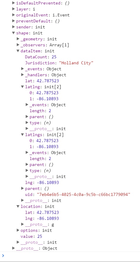 I put a console.log on hover to see what 'e' is, for the point on the map and here is what that looks like (file attached). It shows my object, with my latlng value all thrown into location lat. What value should go into LocationField, so that it ends up a latitude and l