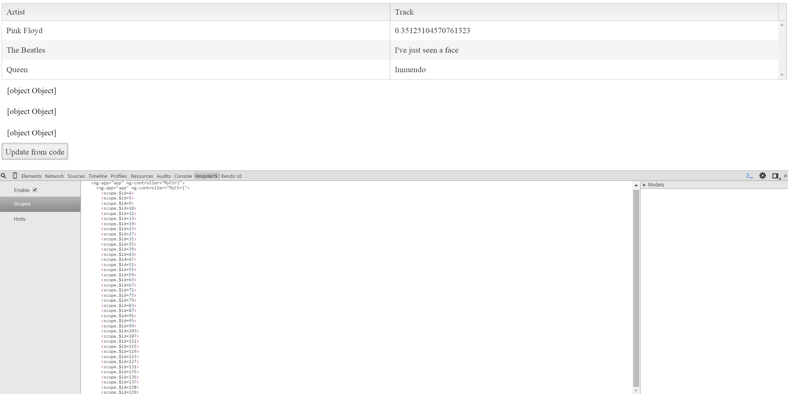 (When directly running in the dojo I could not see the same output in the AngularJS scope view from the Batarang plugin, so maybe it has to be run locally)