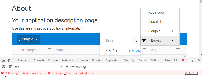 VM643:3 Uncaught ReferenceError: DruhPrijmu_Code is not defined(anonymous function)@ VM643:3render @ kendo.all.js:175proxy @ jquery-1.10.2.js:841createCheckBoxes @ kendo.all.js:34934refresh @ kendo.all.js:34901proxy @ jquery-1.10.2.js:841trigger @ kendo.all.js:124_process @ kendo.all.js:6882success @ kendo.all.js:6627success @ kendo.all.js:6555n.success @ kendo.all.js:5547fire @ jquery-1.10.2.js:3062fireWith @ jquery-1.10.2.js:3174done @ jquery-1.10.2.js:8249callback @ jquery-1.10.2.js:8792XMLHttpRequest.send (async)send @ jquery-1.10.2.js:8720ajax @ jquery-1.10.2.js:8150read @ kendo.all.js:5549read @ kendo.aspnetmvc.js:250(anonymous function) @ kendo.all.js:6552_queueRequest @ kendo.all.js:6742read @ kendo.all.js:6545query @ kendo.all.js:6925_query @ kendo.all.js:6956sort @ kendo.all.js:7013_click @ kendo.all.js:36725proxy @ jquery-1.10.2.js:841dispatch @ jquery-1.10.2.js:5109elemData.handle @ jquery-1.10.2.js:4780After this error grid stop work...