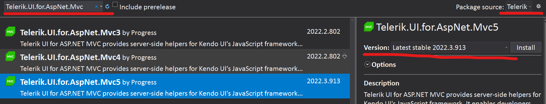 Currently using version 2018.3.911.545 manually installed but when I try and install it through nuget I get version 2016.2.607 as latest stable. This feels odd, especially since when i check latest stable it states version 2022.3.913 https://www.telerik.com/support/whats-new/aspnet-mvc/release-history/ui-for-asp-net-mvc-r3-2022-(version-2022-3-913)