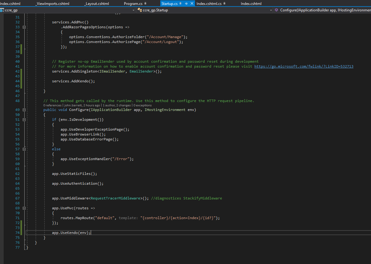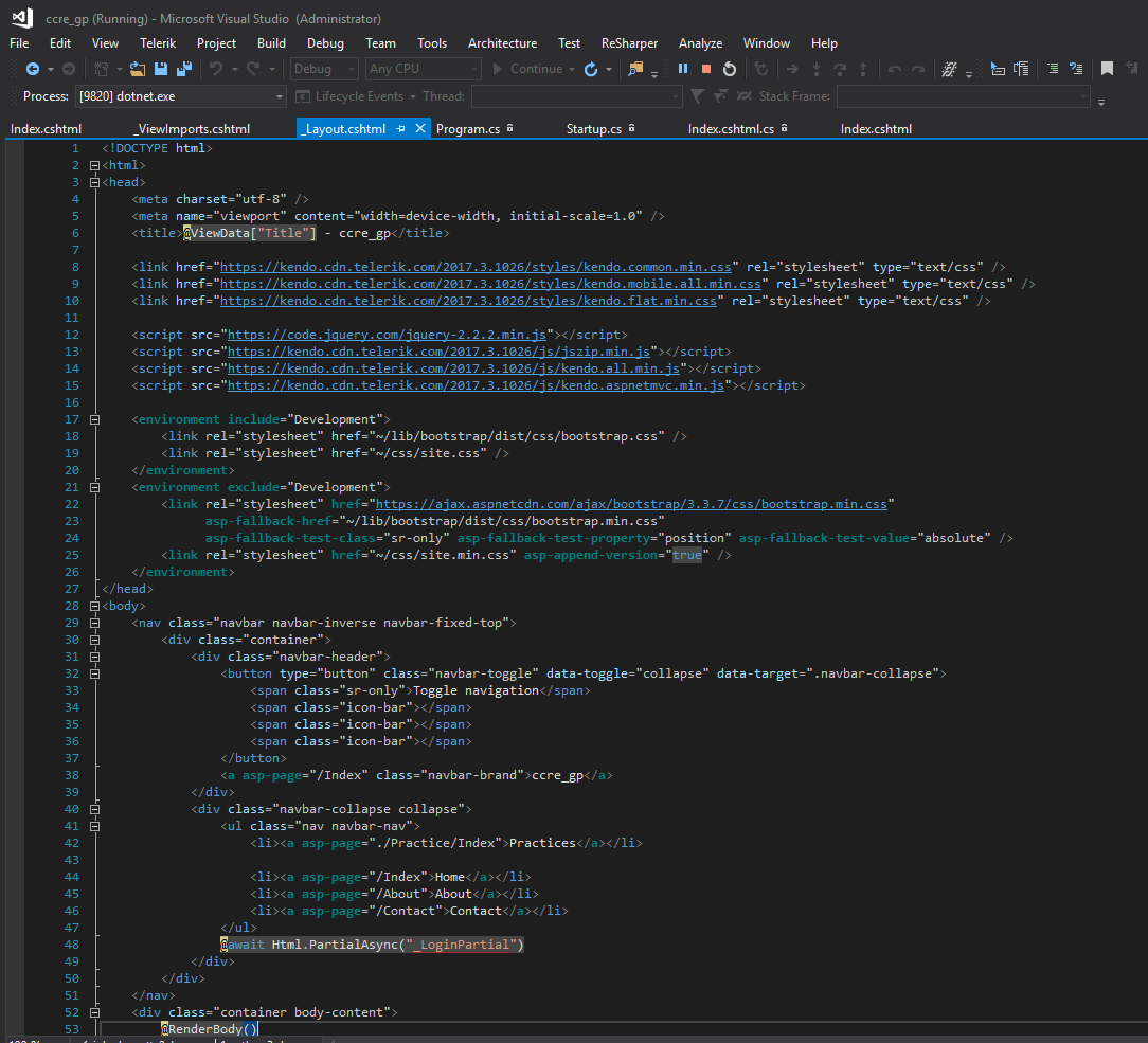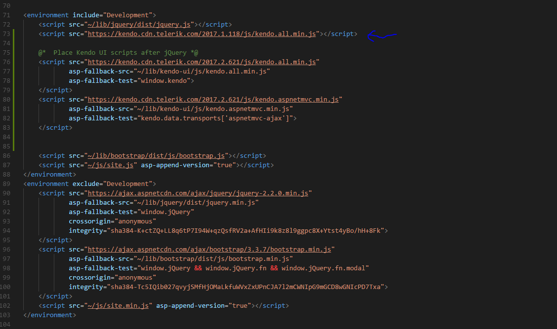 ...<head> <meta charset="utf-8" /> <meta name="viewport" content="width=device-width, initial-scale=1.0" /> <title>@ViewData["Title"] - SSO</title> <environment include="Development"> <link rel="stylesheet" href="~/lib/font-awesome/css/font-awesome.min.css" /> <link rel="stylesheet" href="~/lib/font-awesome/css/font-awesome-badge.css" /> <link rel="stylesheet" href="~/lib/bootstrap/dist/css/bootstrap.css" /> <link rel="stylesheet" href="~/css/site.css" /> <link rel="stylesheet" href="https://kendo.cdn.telerik.com/2019.2.619/styles/kendo.bootstrap-v4.min.css" /> </environment> <environment exclude="Development"> <link rel="stylesheet" href="~/lib/font-awesome/css/font-awesome.min.css" /> <link rel="stylesheet" href="~/lib/font-awesome/css/font-awesome-badge.css" /> <link rel="stylesheet" href="https://ajax.aspnetcdn.com/ajax/bootstrap/3.3.7/css/bootstrap.min.css" asp-fallback-href="~/lib/bootstrap/dist/css/bootstrap.min.css" asp-fallback-test-class="sr-only" asp-fallback-test-property="position" asp-fallback-test-value="absolute" /> <link rel="stylesheet" href="~/css/site.min.css" asp-append-version="true" /> <link rel="stylesheet" href="https://kendo.cdn.telerik.com/2019.2.619/styles/kendo.bootstrap-v4.min.css" /> </environment> </head>...<div> <div class="container"> @RenderBody() <hr /> </div> </div> <environment include="Development"> <script src="~/lib/jquery/dist/jquery.js"></script> <script src="~/lib/bootstrap/dist/js/bootstrap.js"></script> <script src="https://kendo.cdn.telerik.com/2019.2.619/js/kendo.all.min.js"></script> <script src="https://kendo.cdn.telerik.com/2019.2.619/js/kendo.aspnetmvc.min.js"></script> <script src="~/js/site.js" asp-append-version="true"></script> </environment> <environment exclude="Development"> asp-fallback-src="~/lib/jquery/dist/jquery.min.js" asp-fallback-test="window.jQuery" crossorigin="anonymous" integrity="sha384-K+ctZQ+LL8q6tP7I94W+qzQsfRV2a+AfHIi9k8z8l9ggpc8X+Ytst4yBo/hH+8Fk"> </script> asp-fallback-src="~/lib/bootstrap/dist/js/bootstrap.min.js" asp-fallback-test="window.jQuery && window.jQuery.fn && window.jQuery.fn.modal" crossorigin="anonymous" integrity="sha384-Tc5IQib027qvyjSMfHjOMaLkfuWVxZxUPnCJA7l2mCWNIpG9mGCD8wGNIcPD7Txa"> </script> <script src="https://kendo.cdn.telerik.com/2019.2.619/js/kendo.all.min.js"></script> <script src="https://kendo.cdn.telerik.com/2019.2.619/js/kendo.aspnetmvc.min.js"></script> <script src="~/js/site.min.js" asp-append-version="true"></script> </environment>...
