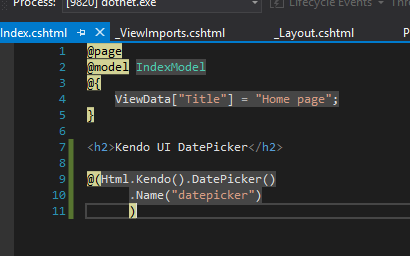 @page@model IndexModel@inject IAuthorizationService AuthorizationService@using Microsoft.AspNetCore.Authorization@inject IProductsToken ProductsToken@using SingleSignOn.Services@using Microsoft.AspNetCore.Http@inject SignInManager<ApplicationUser> SignInManager@inject UserManager<ApplicationUser> UserManager@using Microsoft.AspNetCore.Identity@using SSO.Data;@using Kendo.Mvc.UI@{ ViewData["Title"] = "Services";}...<div class="text-center"> <h2>Kendo UI DatePicker</h2> @(Html.Kendo().DatePicker() .Name("my-picker") )</div>...