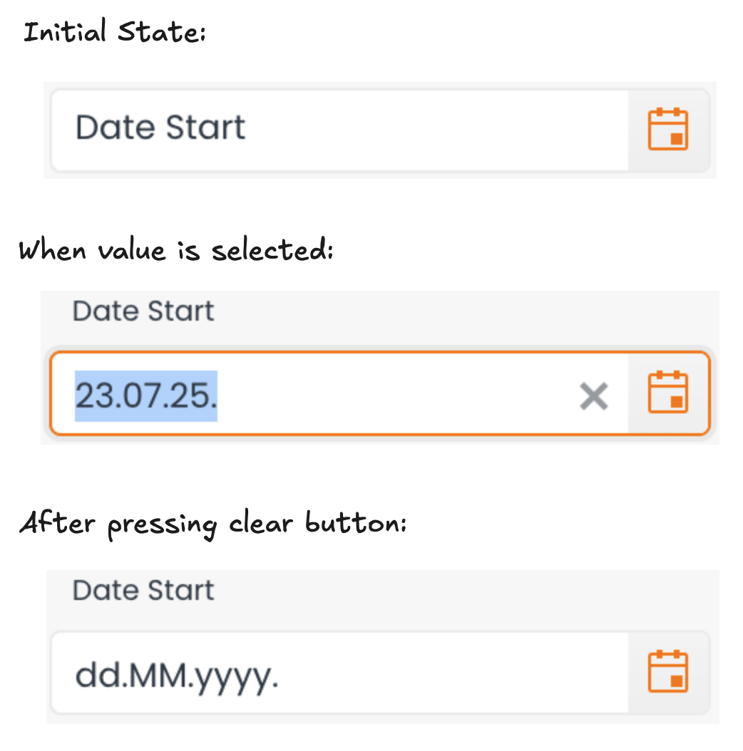 Initial state: The input shows the floating label (Date Start) and the placeholder (dd.MM.yyyy.).