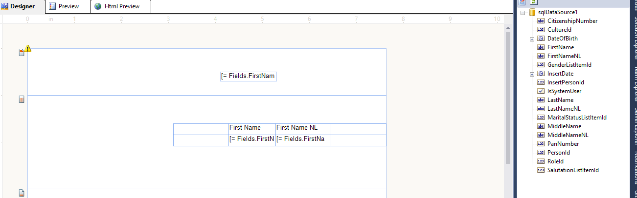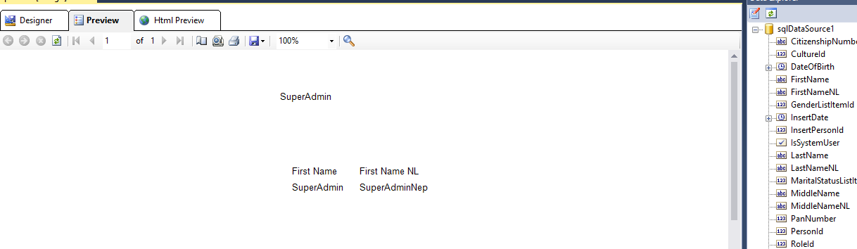 Lastly, I selected the stored procedure and dragged a table using the toolbox and then I opened data explorer dragged the field names from the data source.