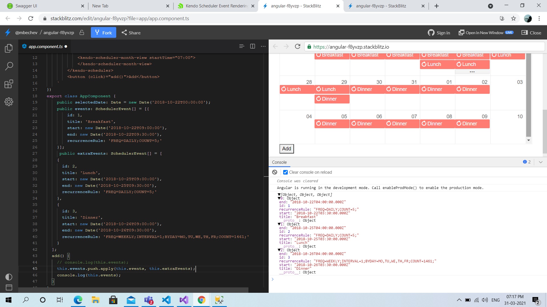 We are integrating kendo scheduler angular which is having issue for data rendering.