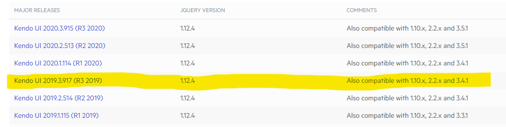 Here is a list of the compatibility of the different Kendo UI versions with the different jQuery versions. For Kendo UI for jQuery v. 2019.3.917 you can see that the supported jQuery versions are 1.10.x, 2.2.x and 3.4.1.
