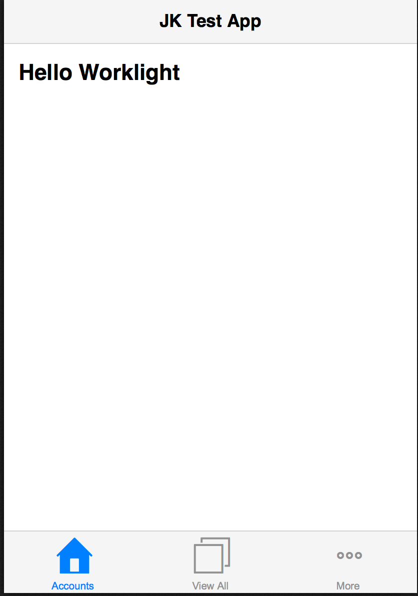 <!DOCTYPE HTML><html> <head> <meta charset="UTF-8"> <title>jktest</title> <meta name="viewport" content="width=device-width, initial-scale=1.0, maximum-scale=1.0, minimum-scale=1.0, user-scalable=0"> <!-- <link rel="shortcut icon" href="images/favicon.png"> <link rel="apple-touch-icon" href="images/apple-touch-icon.png"> --> <link rel="stylesheet" href="css/main.css"> <link href="js/libs/kendoui/styles/kendo.mobile.all.min.css" rel="stylesheet" /> <link href="js/libs/kendoui/styles/kendo.common.min.css" rel="stylesheet" type="text/css" /> <link href="js/libs/kendoui/styles/kendo.silver.min.css" rel="stylesheet" type="text/css" /> <link href="js/libs/kendoui/styles/kendo.silver.mobile.min.css" rel="stylesheet" type="text/css" /> <link href="js/libs/kendoui/styles/kendo.dataviz.min.css" rel="stylesheet" type="text/css" /> <link href="js/libs/kendoui/styles/kendo.dataviz.default.min.css" rel="stylesheet" type="text/css" /> <!-- jQuery --> <!-- Using the jQuery in Kendo UI --> <script src="js/libs/kendoui/js/jquery.min.js"></script> </head> <body style="display: none;"> <!--application UI goes here--> <div data-role="view" id="navbar-home" data-title="JK Test App"> <!-- Header --> <header data-role="header"> <div data-role="navbar"> <span data-role="view-title">JK Test App</span> </div> </header> <!-- Main Content --> <h2>Hello Worklight</h2> <!-- Footer --> <footer data-role="footer"> <div data-role="tabstrip"> <a data-icon="home" href="#">Accounts</a> <a data-icon="organize" href="#">View All</a> <a href="#" data-icon="more">More</a> </div> </footer> </div> <script src="js/initOptions.js"></script> <script src="js/main.js"></script> <script src="js/messages.js"></script> <!-- Kendo UI --> <script src="js/libs/kendoui/js/kendo.all.min.js"></script> <script> var kapp = new kendo.mobile.Application(); </script> </body></html>Sample Code - IBM Worklight, Kendo UI and Angular JS