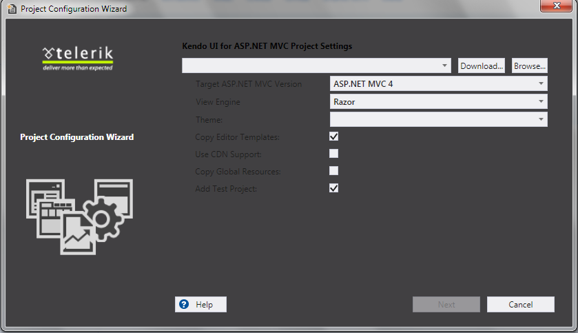 I have installed this VSExtension through the Extension Manager in VS2010. When I attempt to create a new Kendo Project the dialog box doesn't allow me to select an assembly or a theme, and therefore doesn't enable the next button to continue.