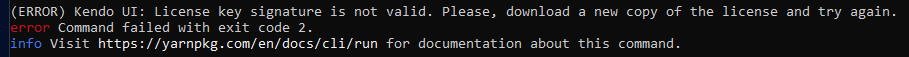 We are currently experiencing warnings saying that license activation failed. I followed your example approach to applying license but I get the error saying that the license is not valid. I tried using both yarn and npx commands from the docs (https://www.telerik.com/kendo-react-ui/components/my-license/#toc-install-or-update-a-license-key).